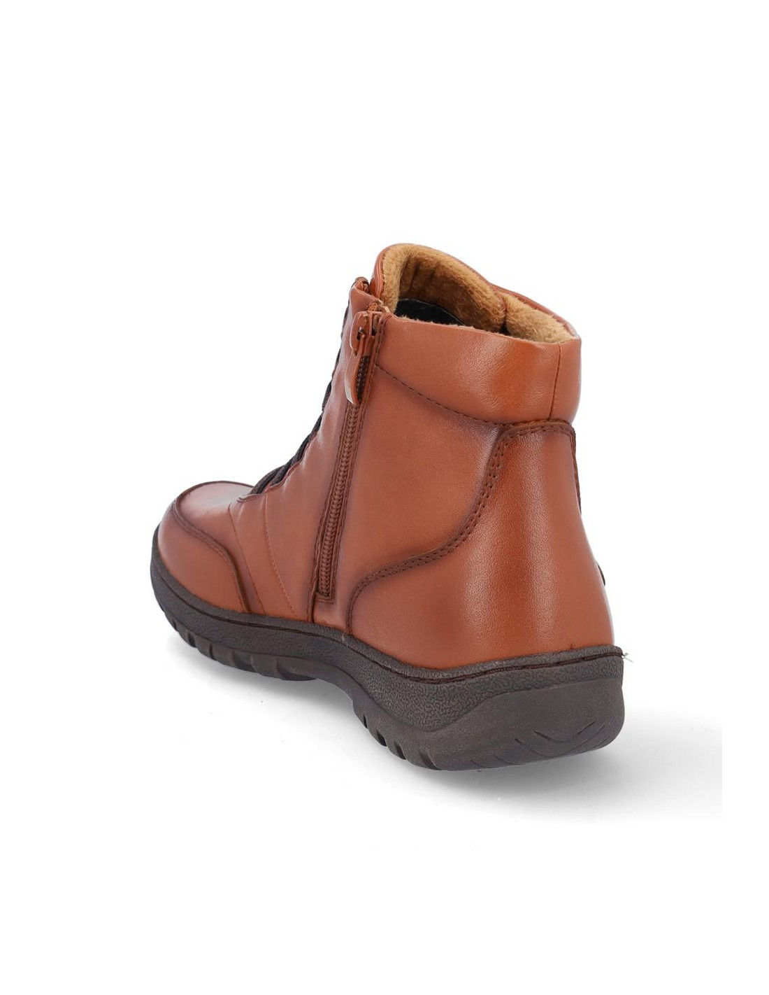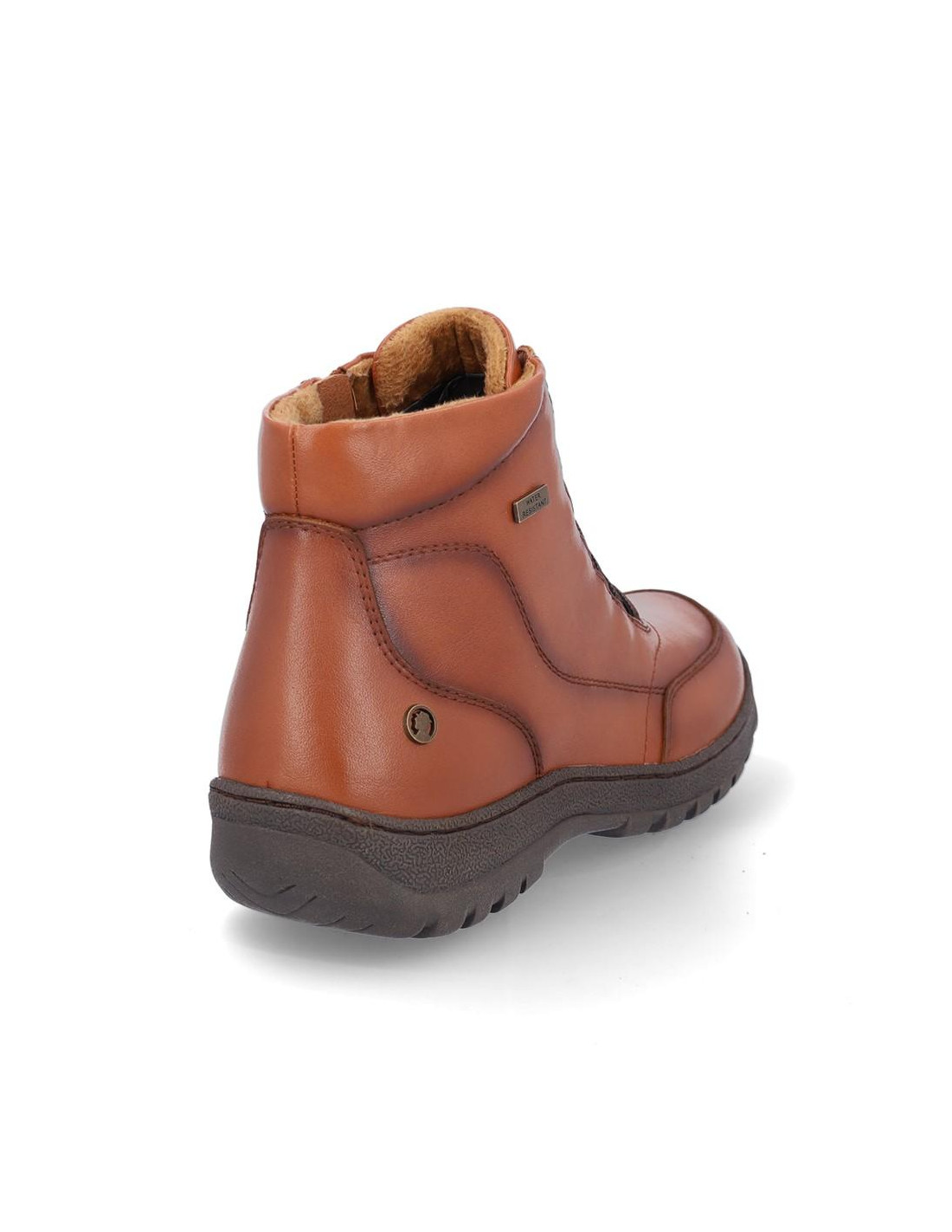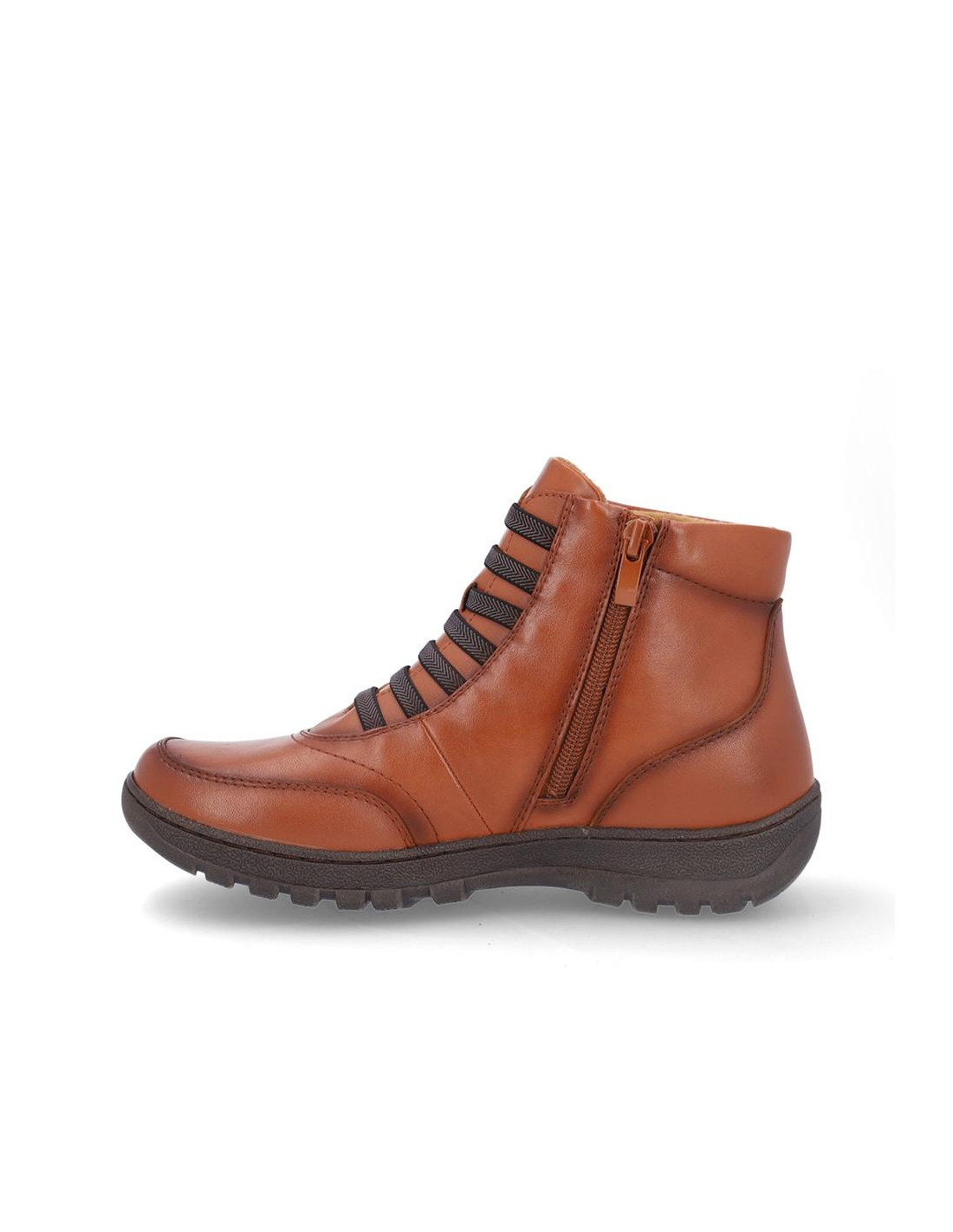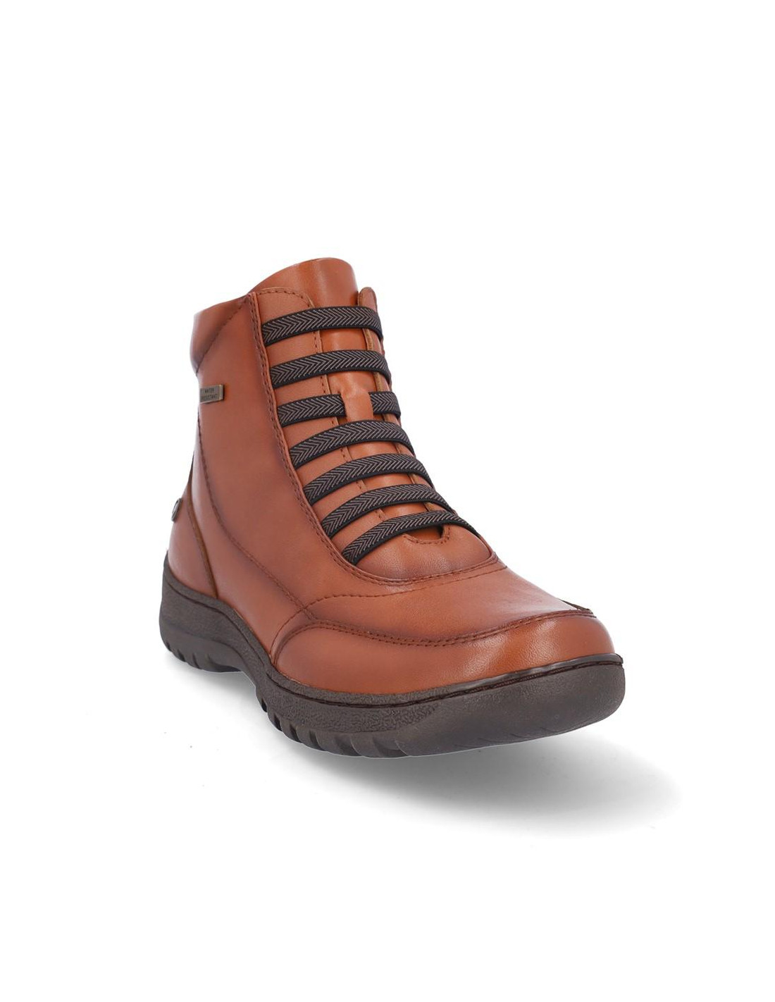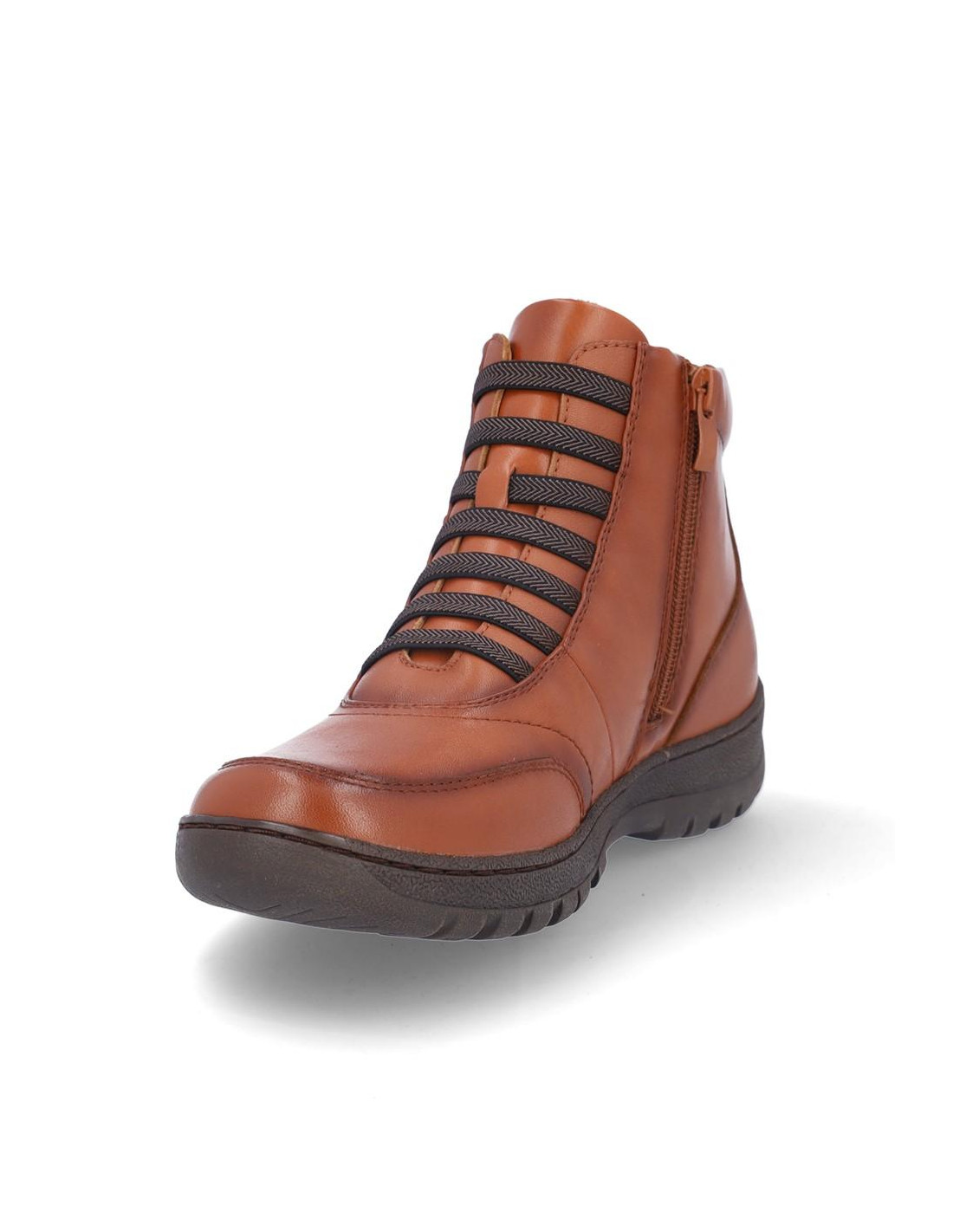Botines de señora Coronel Tapiocca en piel color camel resistente al agua. Cierre con cordones elasticos y cremallera en parte interior para facilitar la puesta y retirada, forro textil, plantilla textil. Altura de caña 11 cm, suela de 3 cm de altura. Composición: Empeine: Piel. Forro: Textil. Plantilla: textil. Suela: Fibra sintética. Componente principal: Piel