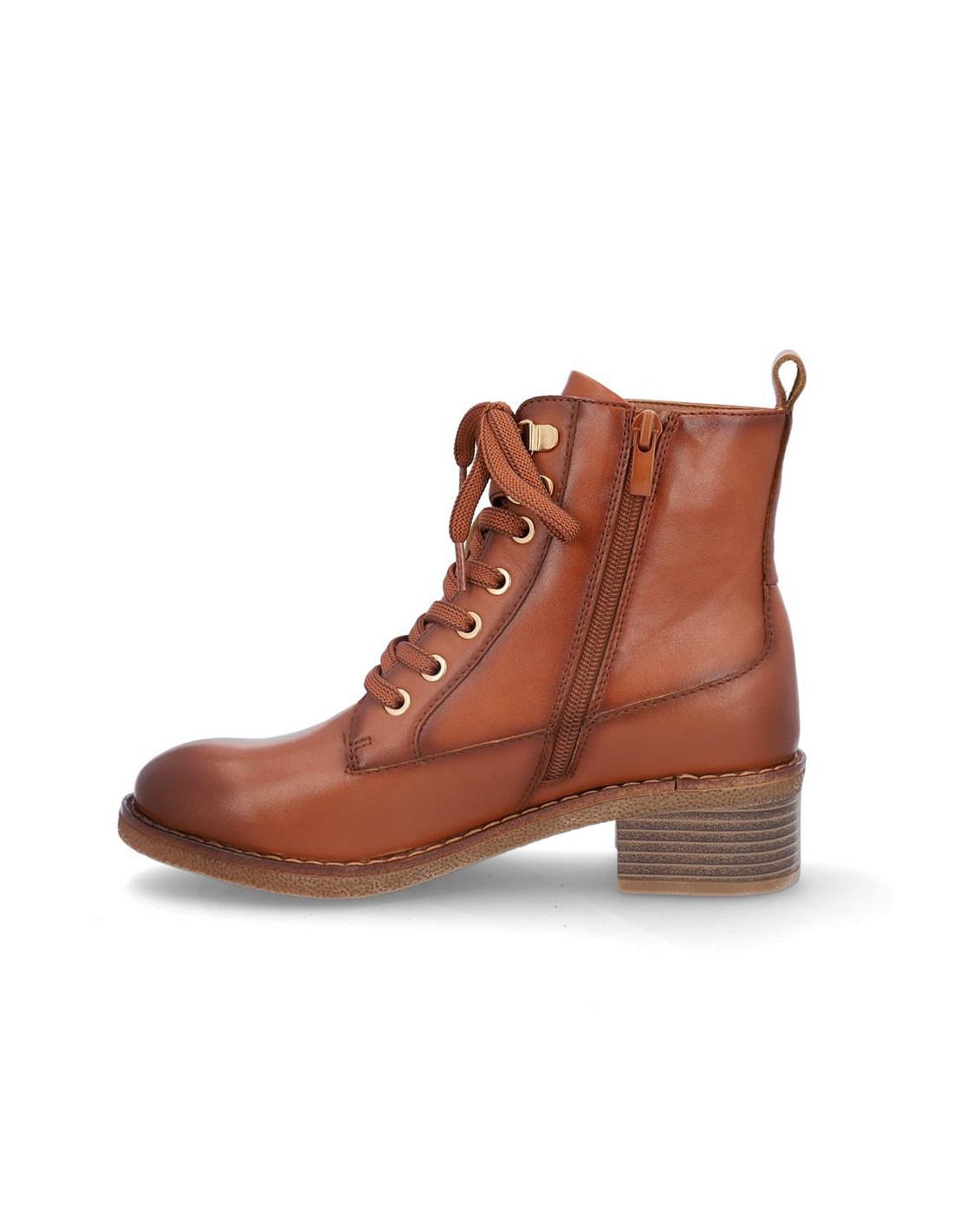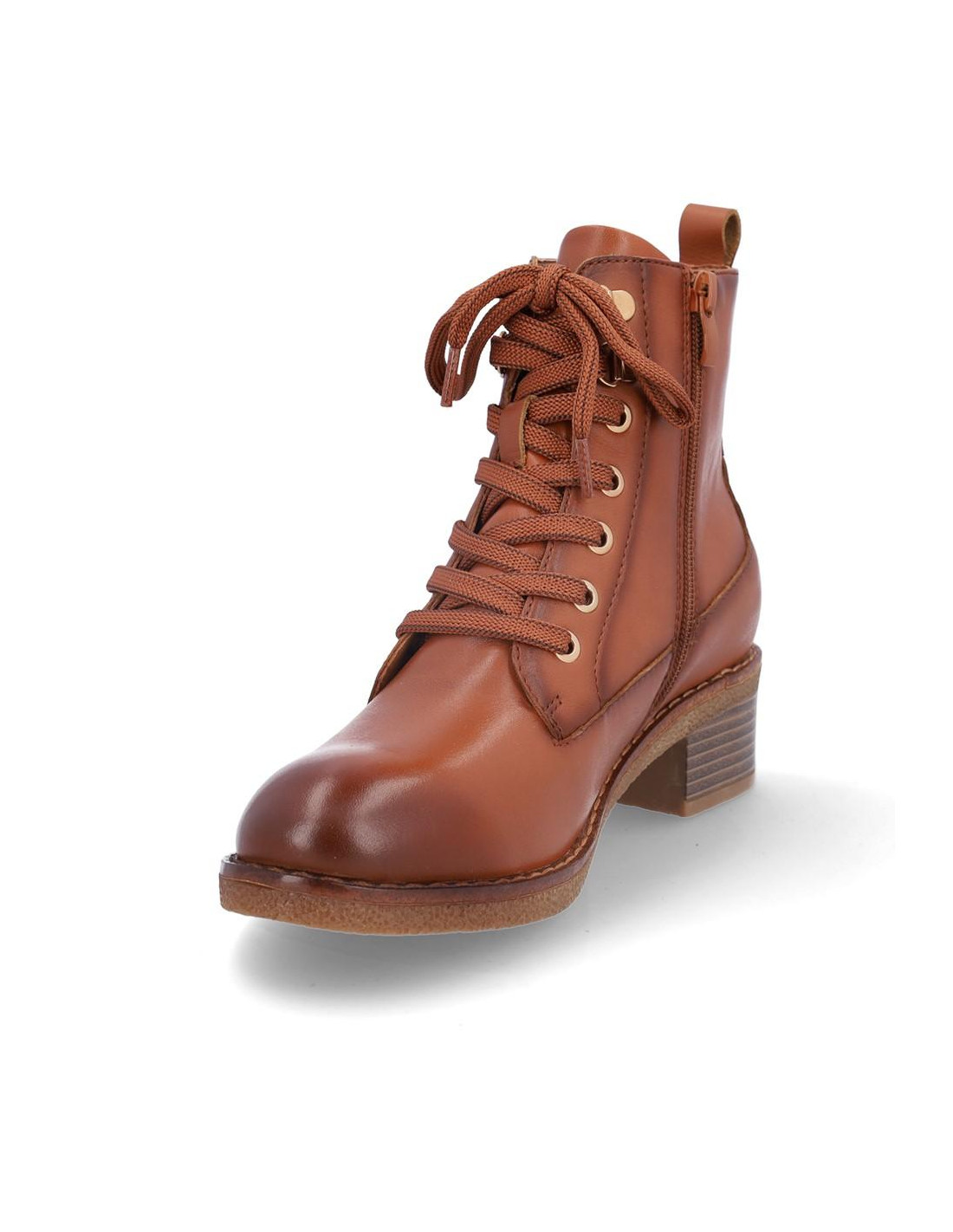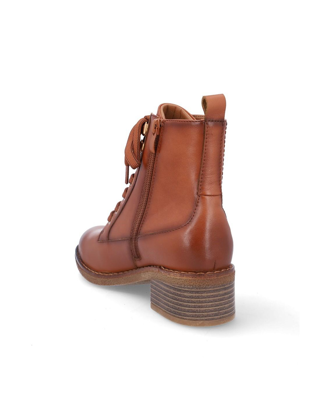 Botines de señora Coronel Tapiocca en piel color camel, resistente al agua, cierre de cordones y cremallera en parte interior para facilitar la puesta y retirada, Forro textil con vista de piel, plantilla textil, altura de caña 13 cm, suela con tacón de 5 cm y plataforma de 1'5 cm. Composición: Empeine: Piel. Forro: Textil/piel. Plantilla: Textil. Suela: Fibra sintética. Componente principal: Piel