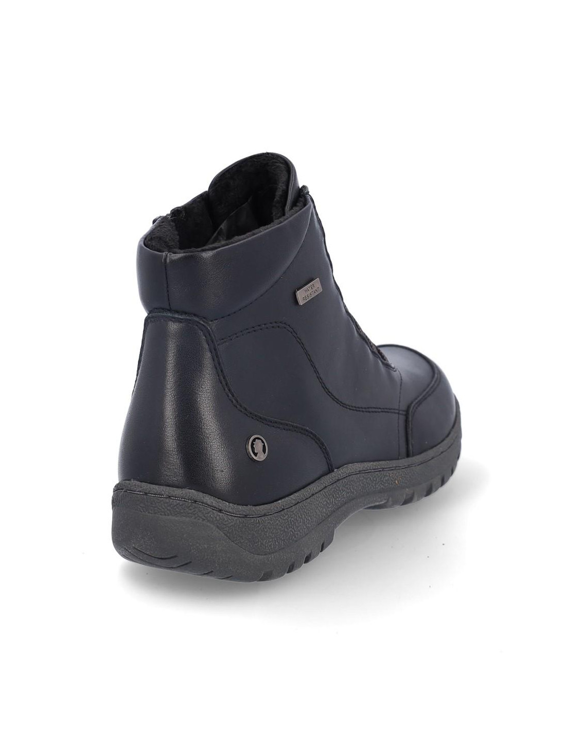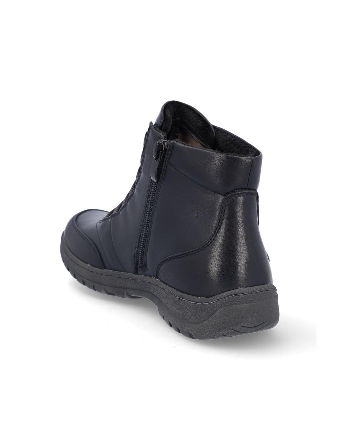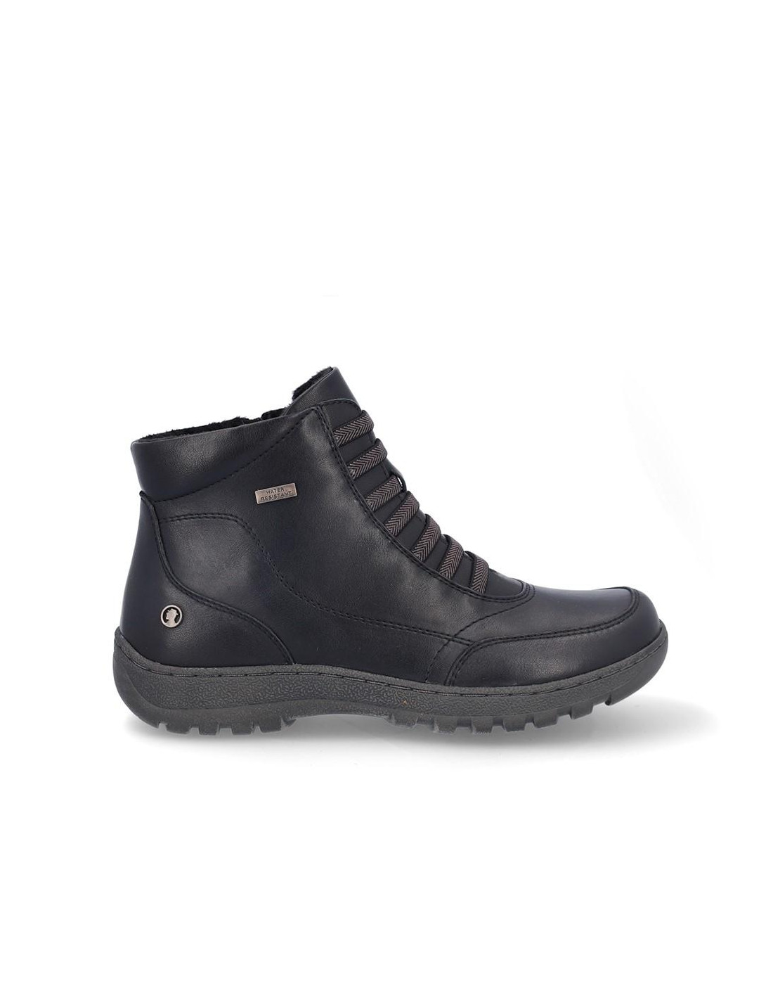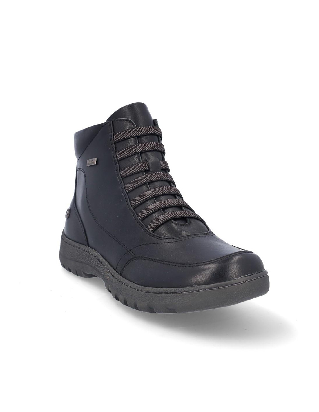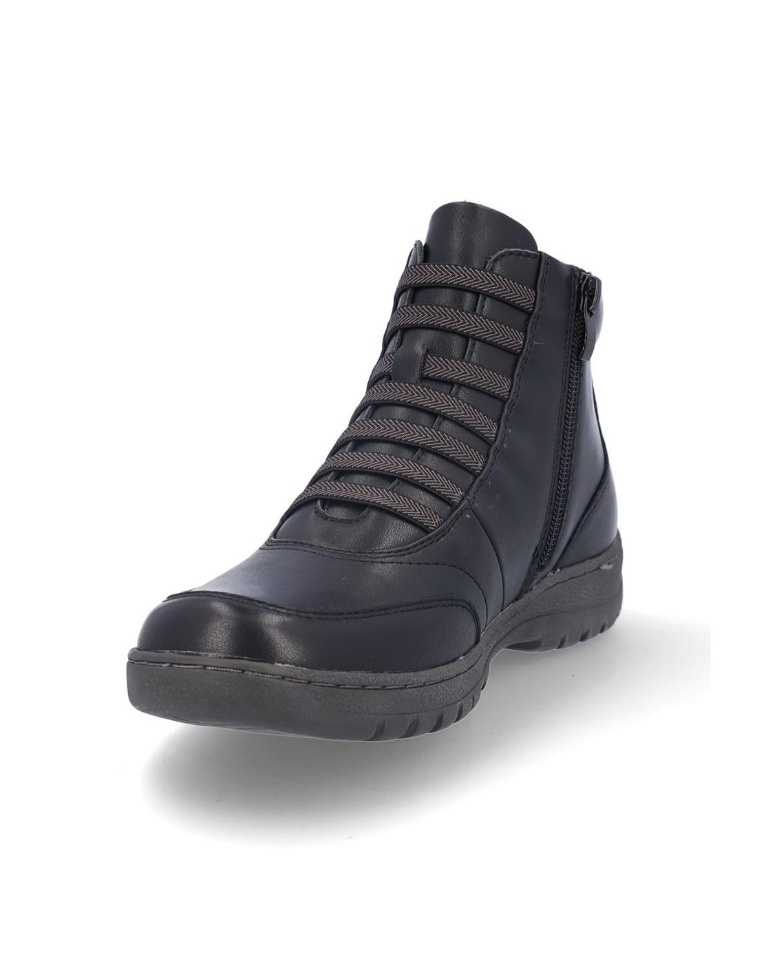 Botines de señora Coronel Tapiocca en piel color negro resistente al agua. Cierre con cordones elasticos y cremallera en parte interior para facilitar la puesta y retirada, forro textil, plantilla textil. Altura de caña 11 cm, suela de 3 cm de altura. Composición: Empeine: Piel. Forro: Textil. Plantilla: textil. Suela: Fibra sintética. Componente principal: Piel