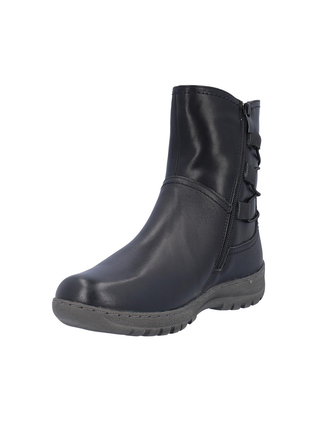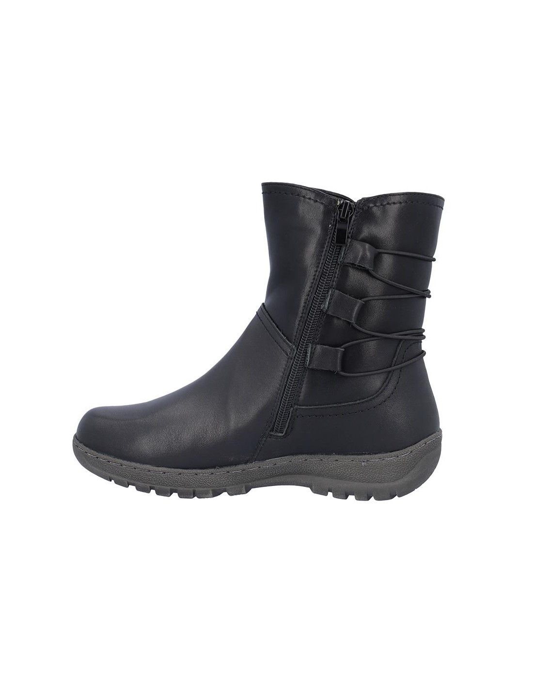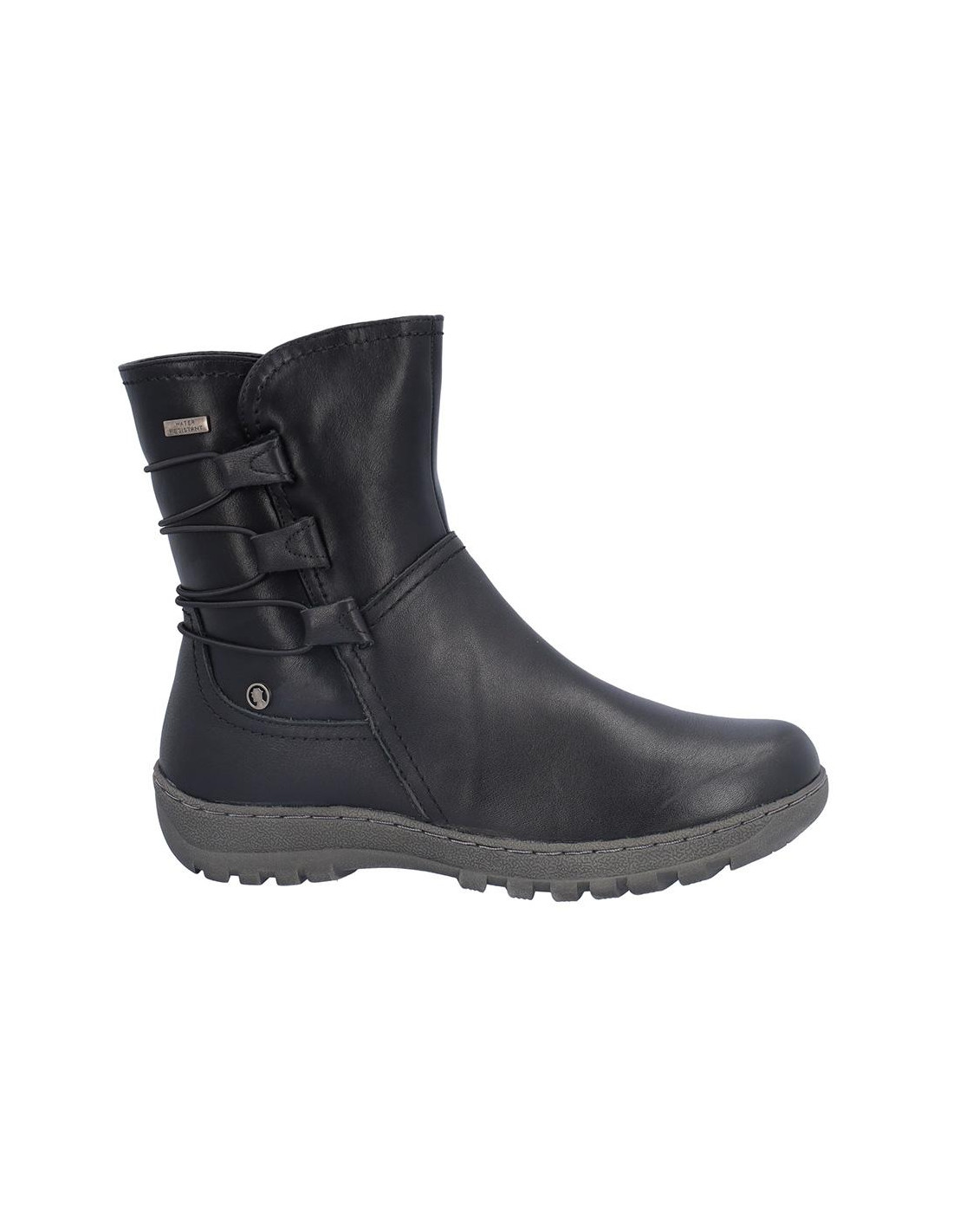 Botines impermeables de señora Coronel Tapiocca en piel color negro. Forro textil con vista de piel, plantilla textil, con cremallera en parte interior para facilitar la puesta y retirada, altura de caña 15 cm, suela de 3 cm. Composición: Empeine: Serrajel. Forro: Piel/textil. Plantilla: textil. Suela: Fibra sintética. Componente principal: Serraje