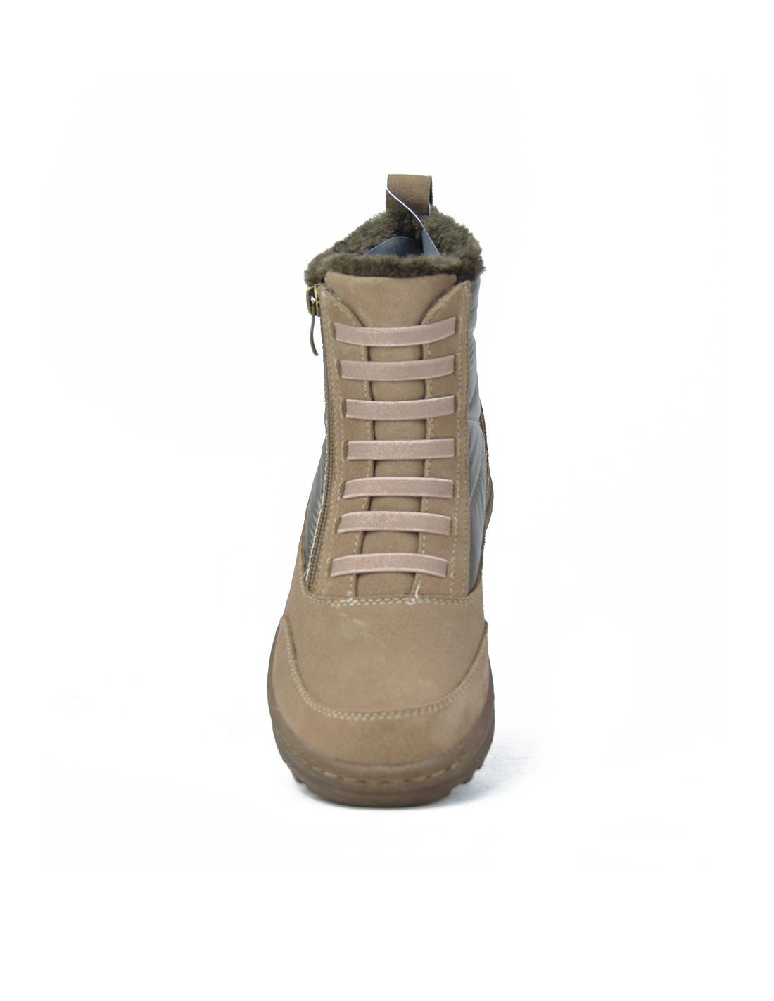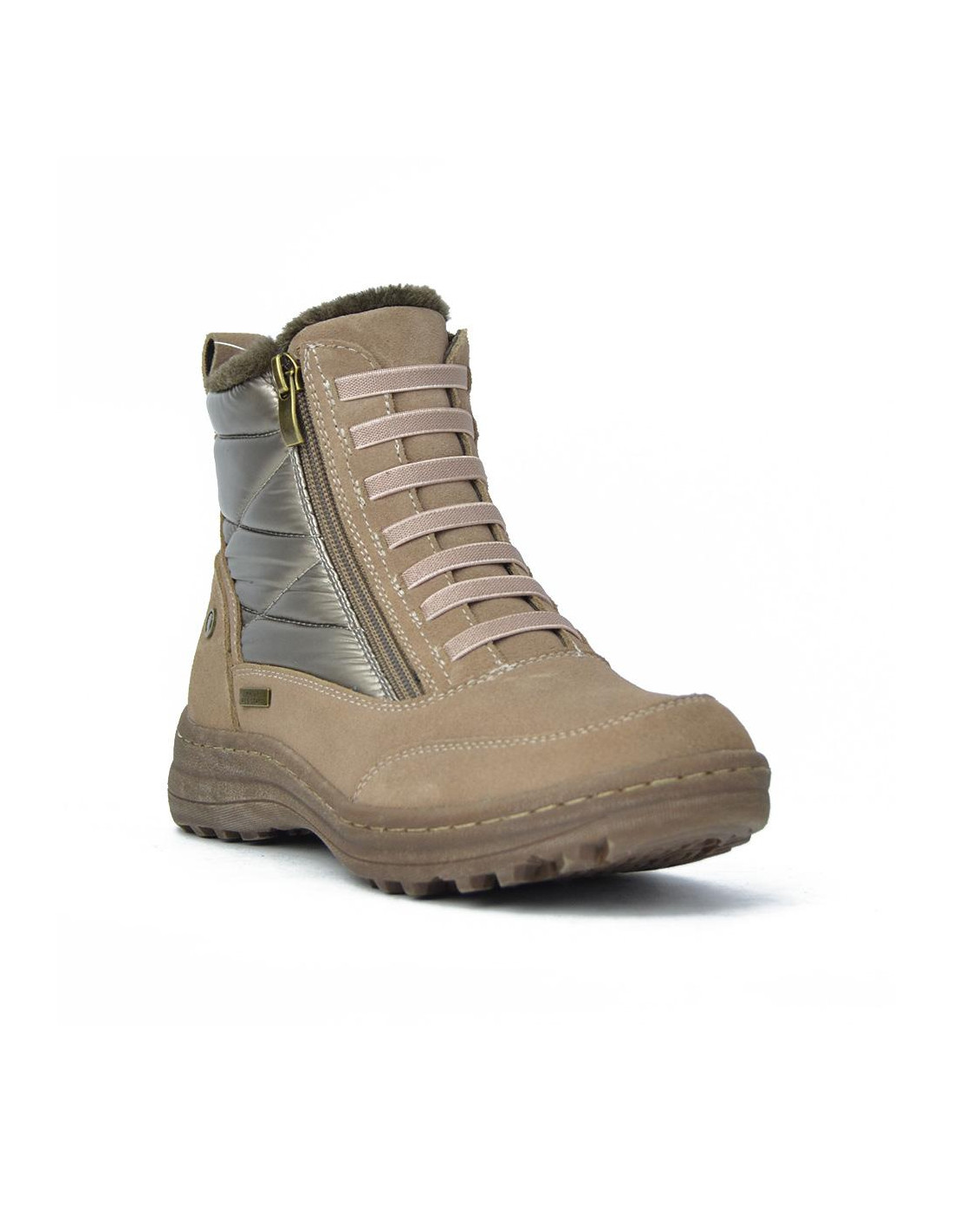 Botines impermeables Coronel Tapiocca mujer, fabricado en serraje y tejido beige resistente al agua, forro de pelo en boca de bota e interior, con cordoles elasticos y cremallera lateral para facilitar la puesta y retirada del producto, plantilla textil extraible termoconformada, atura de caña 12 cm, altura de suela 3 cm. Composición: Empeine: Piel. Forro y plantilla: Textil. Suela: Fibra sintetica.