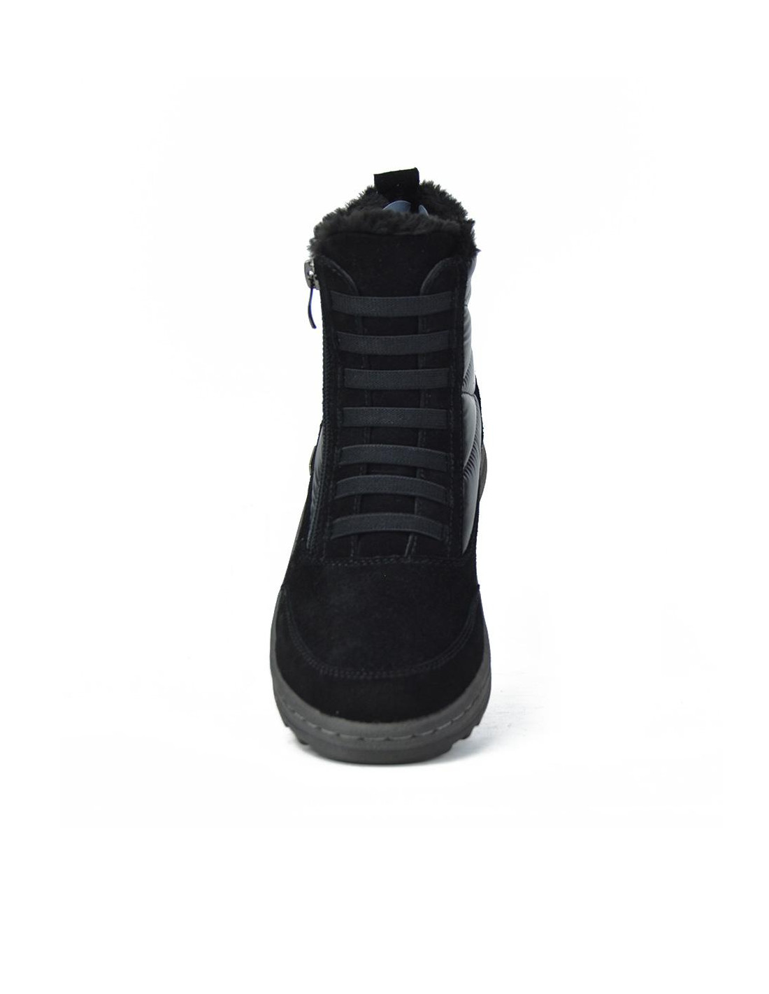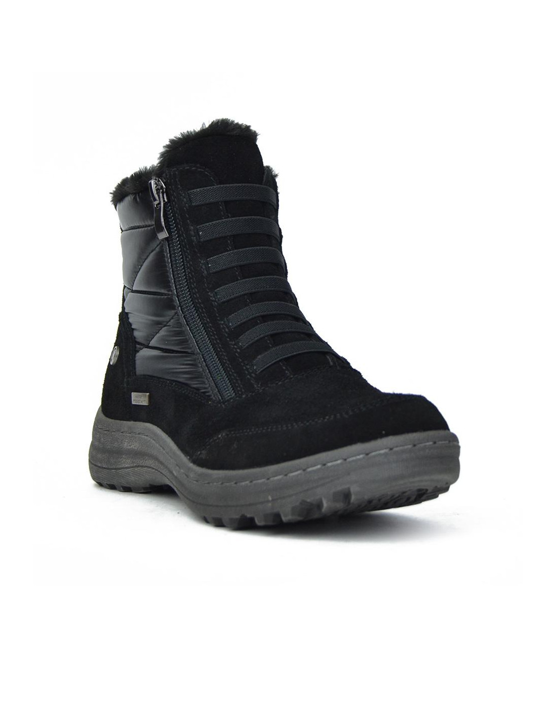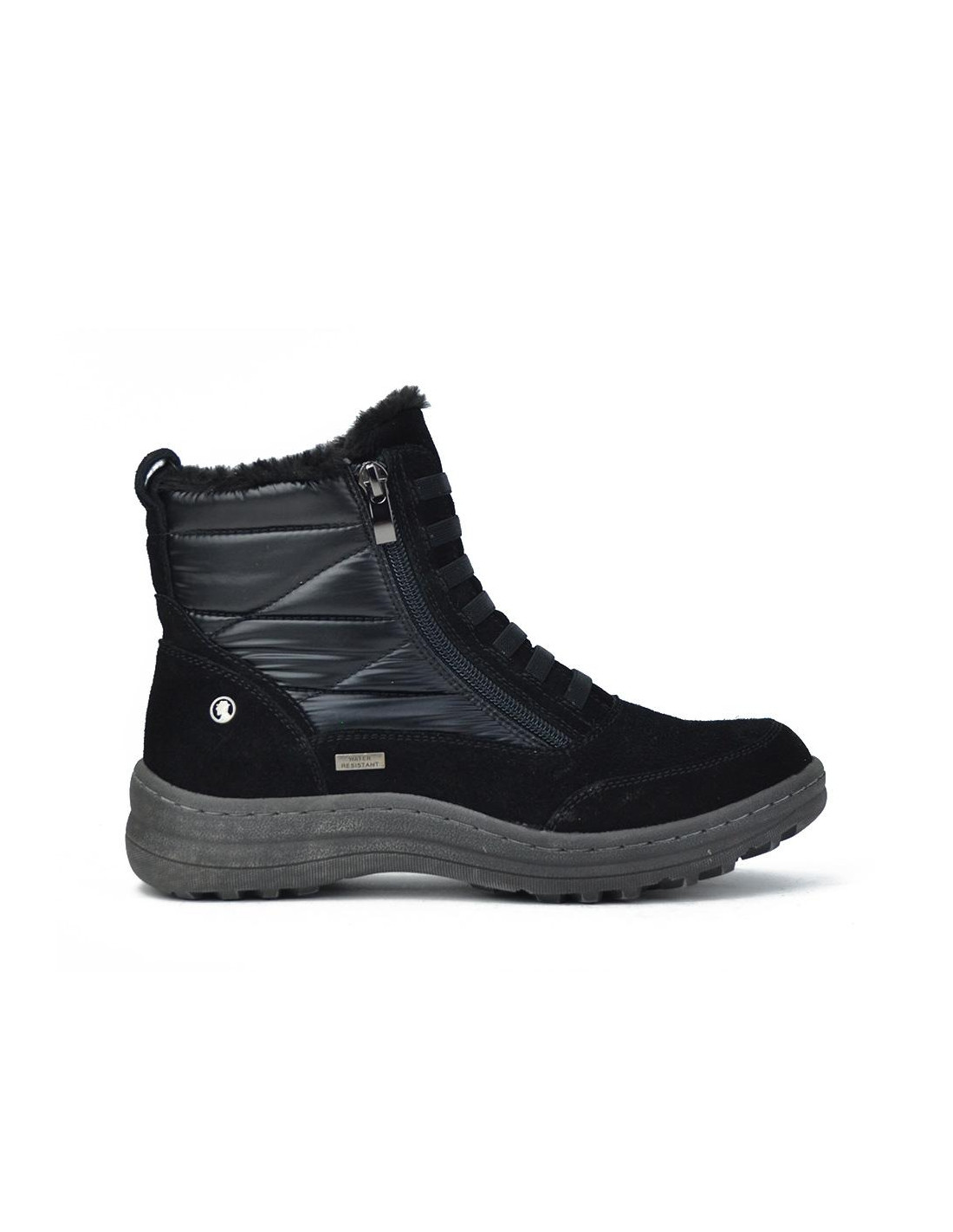 Botines impermeables Coronel Tapiocca mujer, fabricado en seraje y tejido negro resistente al agua, forro de pelo en boca de bota e interior, con cordones elásticos y cremallera lateral para facilitar la puesta y retirada del producto, plantilla textil extraerle termo conformada, atura de caña 12 cm, altura de suela 3 cm. Composición: Empeine: Piel. Forro y plantilla: Textil. Suela: Fibra sintética.